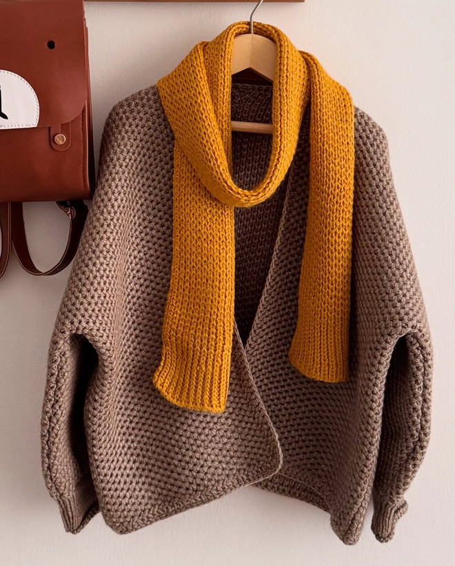 استایل گرم و شیک برای روزهای پاییزی. بافتِ ضخیم و درشتباف، با آستینهای پفی و آزاد که حس گرمی و راحتی میده.